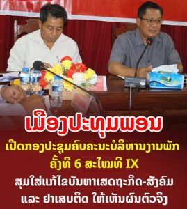 ເມືອງປະທຸມພອນ ເປີດກອງປະຊຸມຄົບຄະນະບໍລິຫານງານພັກ ຄັ້ງທີ 6 ສະໄໝທີ IX: ສຸມໃສ່ແກ້ໄຂບັນຫາເສດຖະກິດ-ສັງຄົມ ແລະ ຢາເສບຕິດ ໃຫ້ປາກົດຜົນເປັນຈິງ ...