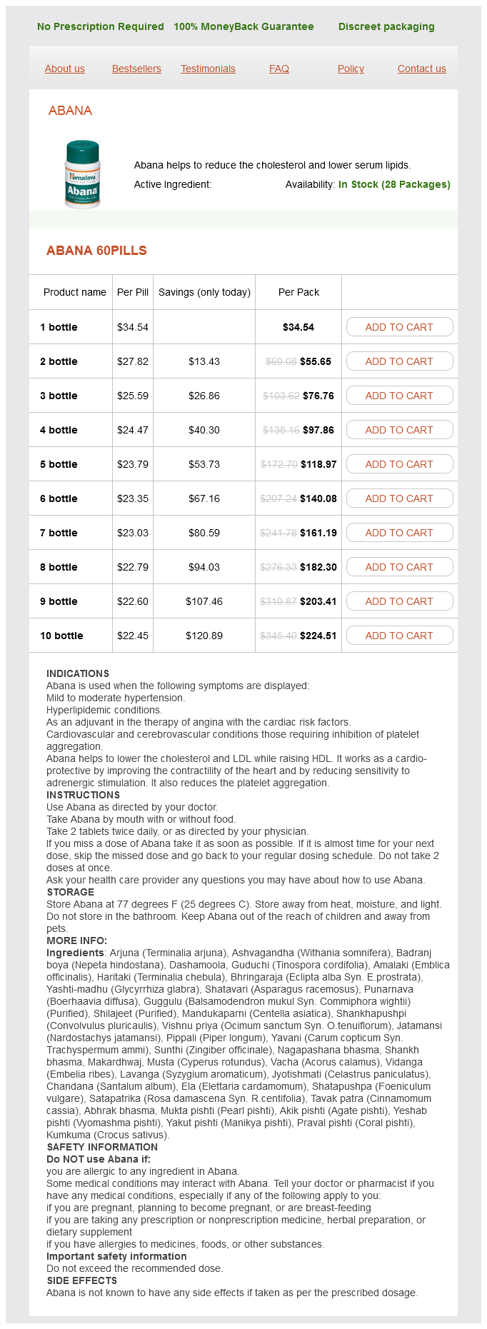 Because corticosteroids can cause fluid retention cholesterol ratio readings uk generic abana 60 pills with mastercard, salt substitutes or spices may be healthy alternatives to table salt. Avoid cured or smoked meats, canned vegetables and soups, salty snacks, and pickled foods. Assessment throughout administration: Ineffective Airway Clearance Impaired Physical Mobility Urinary Retention Impaired Urinary Elimination Incontinence Deficient Knowledge (Drug Therapy) Risk for Injury, related to adverse effects of drug therapy Assess for desired therapeutic effects dependent on the reason for the drug. Implementation Interventions and (Rationales) Ensuring therapeutic effects: Patient-Centered Care Encourage the patient, family, or caregiver to practice supportive measures along with drug therapy to maximize therapeutic effects. Drug onset is in approximately 60 min with increased urination and peristalsis following. Instruct the patient to report dyspnea, salivation, sweating, or extreme fatigue immediately, because these are signs of a potential overdose. Weakness occurring 3 h or longer after dose may indicate underdosage, drug resistance, or myasthenic crisis. Drugs affecting the ganglia have the potential to produce widespread, nonselective effects on the body. Because nicotine acts at the ganglia, both parasympathetic and sympathetic responses are stimulated. Although responses are variable, stimulation of organ activity generally occurs first with low doses. The heart rate and blood pressure increase, although these parameters may subsequently decrease due to the baroreceptor reflex. As the level of nicotine in the blood falls, these same organ systems may become depressed. Acute toxicity, which can occur due to the accidental ingestion of insecticides containing nicotine, may cause death due to paralysis of the respiratory muscles. The chronic effects of nicotine in tobacco smokers such as lung cancer and emphysema are well documented and presented in Chapter 8. Use of these products reduces the uncomfortable symptoms of nicotine withdrawal, such as difficulty sleeping, lack of concentration, depression, headaches, and food cravings. As tobacco use diminishes over an 8- to 12-week period, these products are gradually withdrawn. The nurse should remember, however, that psychological dependence also occurs with nicotine and that most successful smoking cessation programs include behavioral modification therapy such as self-help groups. From what you learned in Chapter 16, give the locations where each of these receptors may be found. To aid in urinary elimination, the health care provider has ordered bethanechol (Urecholine) 20 mg three times per day. Because the medication has demonstrated some effectiveness in achieving bladder emptying, Hilda will be discharged on this medication until she sees the health care provider 2 weeks after discharge.