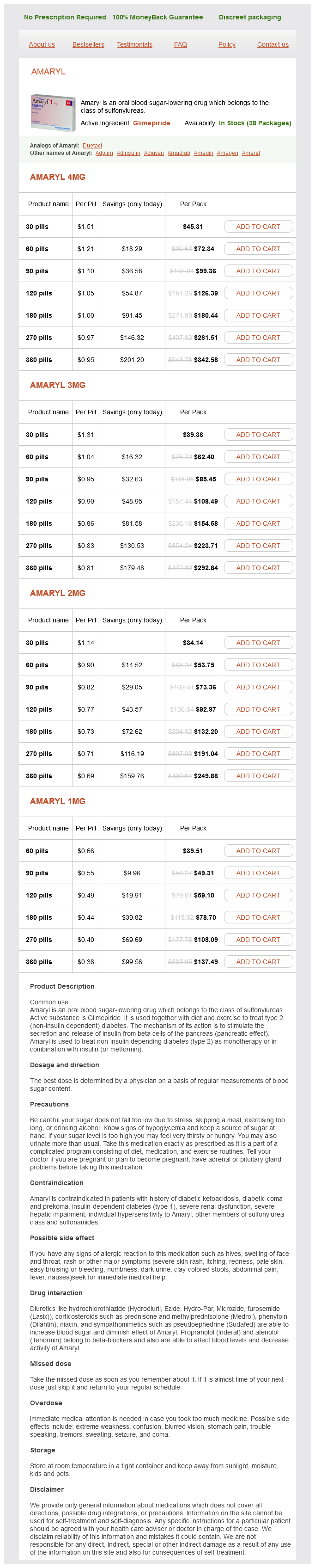 Amaryl packs: 30 pills, 60 pills, 90 pills, 120 pills, 180 pills, 270 pills, 360 pills