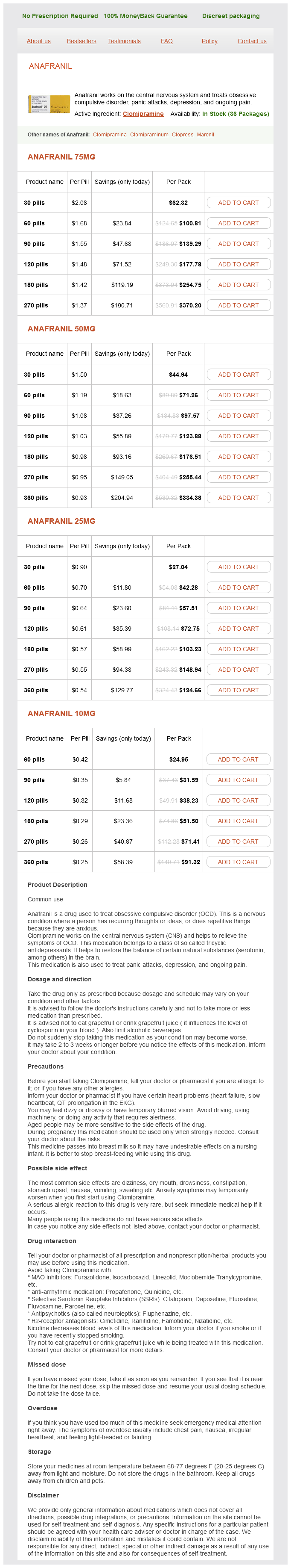 Anafranil dosages: 75 mg, 50 mg, 25 mg, 10 mg