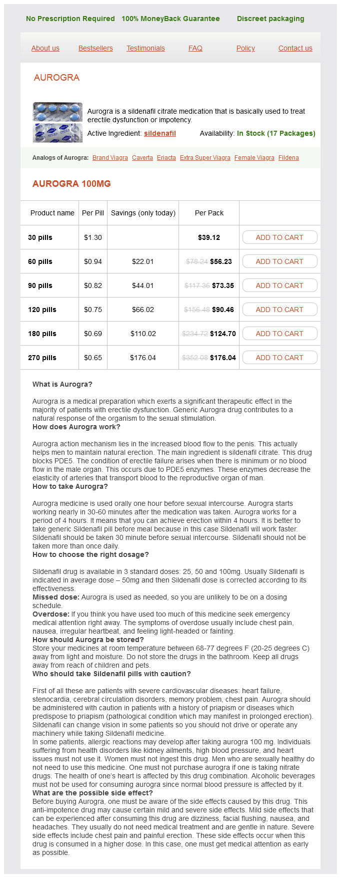 Aurogra packs: 30 pills, 60 pills, 90 pills, 120 pills, 180 pills, 270 pills