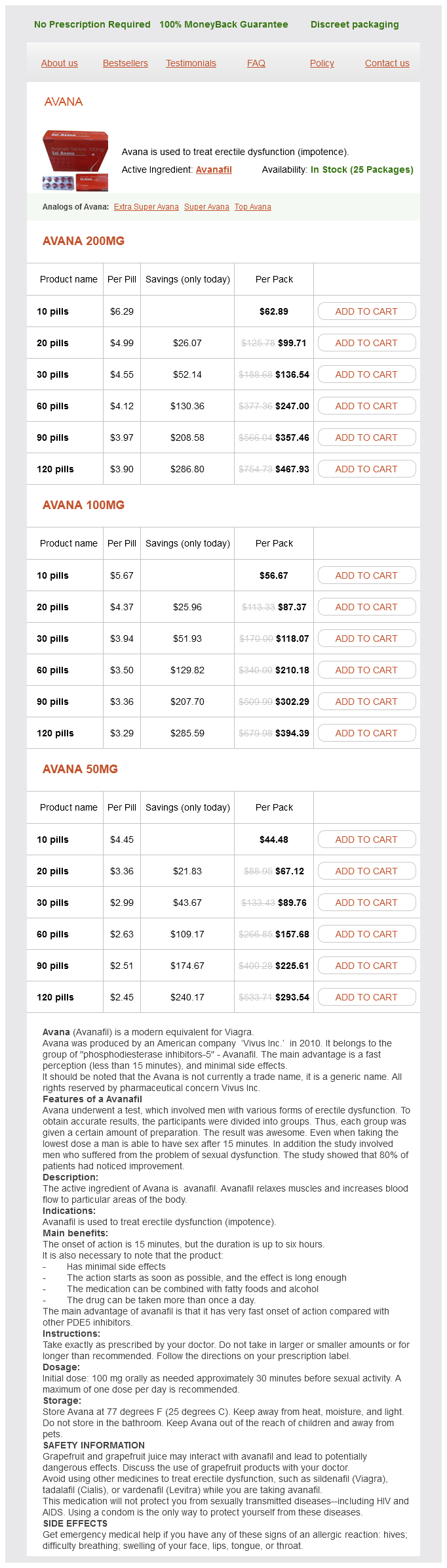 Avana packs: 10 pills, 20 pills, 30 pills, 60 pills, 90 pills, 120 pills