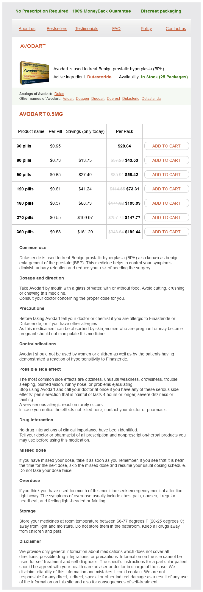 Avodart packs: 30 pills, 60 pills, 90 pills, 120 pills, 180 pills, 270 pills, 360 pills