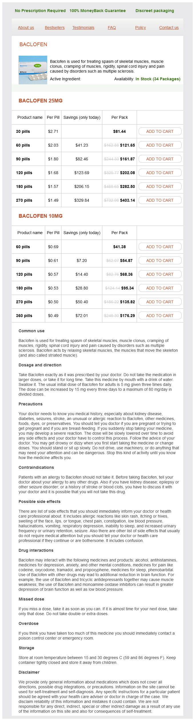 Baclofen packs: 30 pills, 60 pills, 90 pills, 120 pills, 180 pills, 270 pills, 360 pills