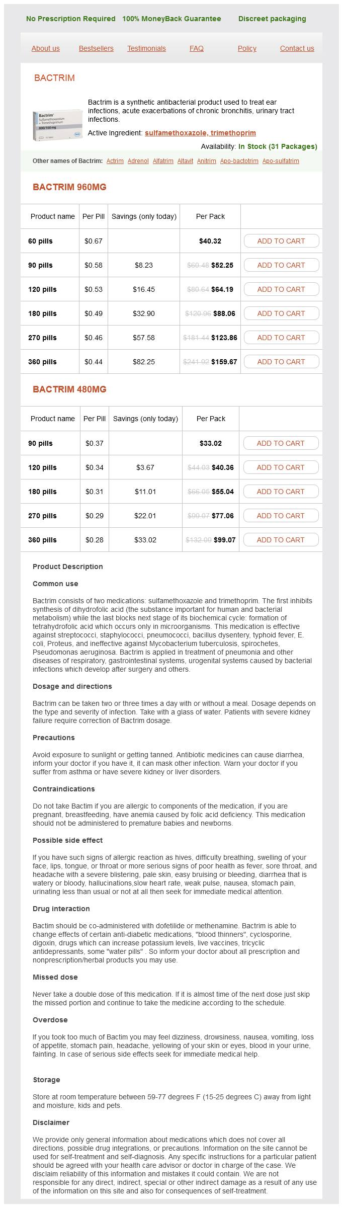 Bactrim packs: 60 pills, 90 pills, 120 pills, 180 pills, 270 pills, 360 pills