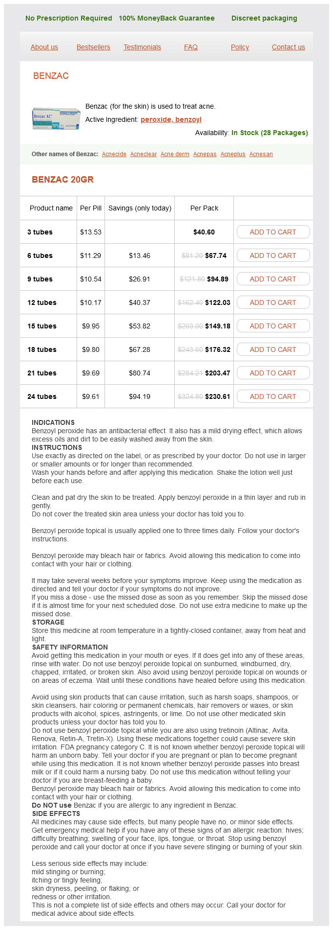In this study skin care on center benzac 20 gr buy low cost, treatment with fingolimod was not associated with any drug-related serious events. However, an emerging cell-based strategy still in its infancy has tremendous potential for restoration of neurological function after stroke. Stem cell-based strategies can potentially replace neurons and the supporting milieu, and may trophically stimulate endogenous repair mechanisms to promote neurogenesis, angiogenesis, and remodeling. Stem cell therapies can be delivery intravenously, intra-arterially, intranasally, intraventricularly, or via direct injection. When administered, stem cells/progenitor cells exhibit the ability to migrate to pathological sites, a mechanism called pathotrophism. These cells express chemokine receptors, such as chemokine receptor type 4, and undergo chemotaxis toward cytokines secreted from damaged brain, including stromal cell-derived factor 1, monocyte chemotactic protein-1, chemokine ligand 2, and other cytokines. This tumorigenic potential, however, can be minimized by in vitro neural pre-differentiation methods. Instead, functional recovery is attributed to the angiogenesis and growth factor secretion from these cells that promote neurogenesis by inducing migration of endogenous progenitor cell from subventricular zones to sites of injury, and by promoting synaptogenesis through axonal remodeling to adapt the existing neuronal circuits to injured circuits. At 1 year, when compared to preoperative baseline testing, treated patients had improved motor function and functional capacity. The results showed good safety and feasibility, and had either modest functional improvements or no appreciable difference. Of the 129 patients enrolled in the study, 67 were randomized to receive multipotent adult progenitor cells and the remaining 62 patients were given a placebo treatment. These include randomized controlled trials exploring various delivery routes and cell types to discern maximum benefit. Forecasting the future of stroke in the United States: a policy statement from the American Heart Association and American Stroke Association. Heart disease and stroke statistics-2013 update: a report from the American Heart Association. Clinical alert: benefit of carotid endarterectomy for patients with high-grade stenosis of the internal carotid artery. National Institute of Neurological Disorders and Stroke stroke and trauma division. The nitrous oxide method for the quantitative determination of cerebral blood flow in man: theory, procedure and normal values. Cerebral blood flow measurements and electroencephalograms during carotid endarterectomy. Comparison of analytic methods for calculation of cerebral blood flow after intracarotid injection of 133 Xe. Cortical evoked potential and extracellular K+ and H+ at critical levels of brain ischemia. Glutamate receptor-induced 45Ca2+ accumulation in cortical cell culture correlates with subsequent neuronal degeneration.