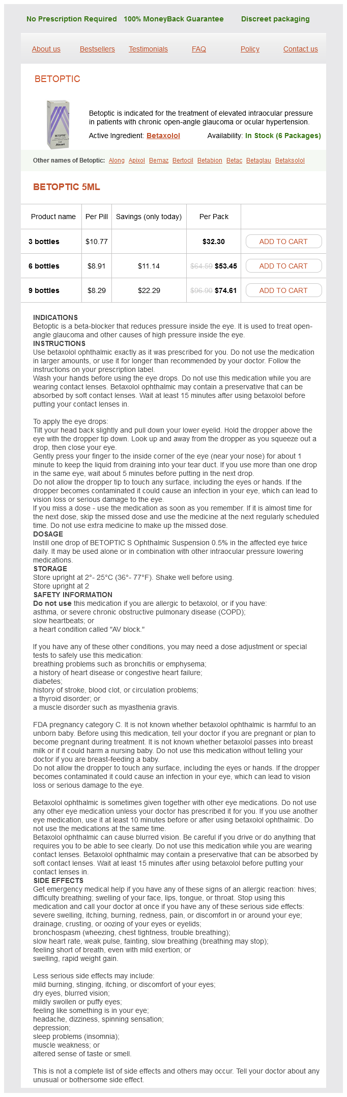 Betoptic packs: 3 bottles, 6 bottles, 9 bottles