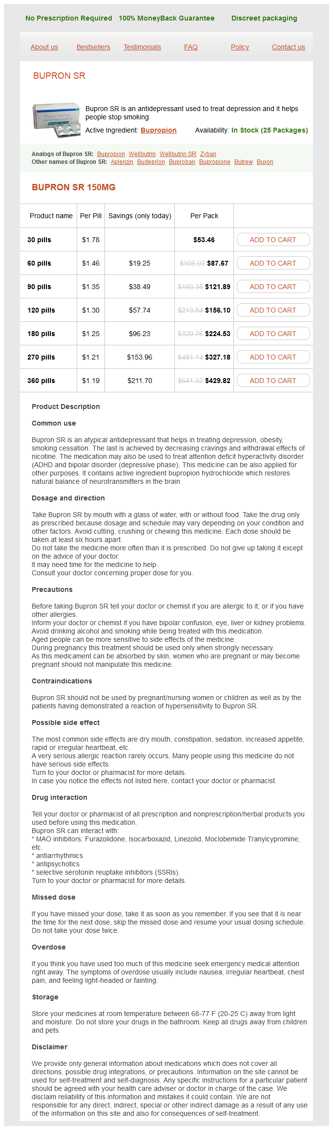 Bupron SR packs: 30 pills, 60 pills, 90 pills, 120 pills, 180 pills, 270 pills, 360 pills