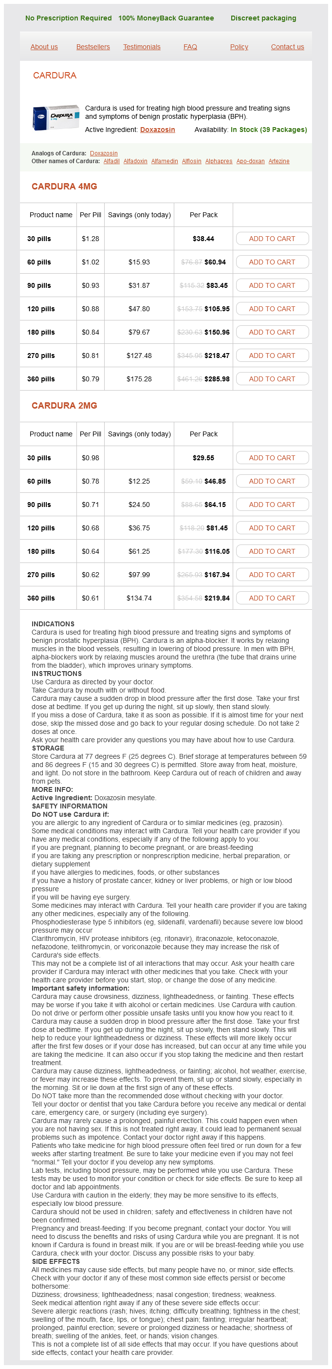 Cardura packs: 30 pills, 60 pills, 90 pills, 120 pills, 180 pills, 270 pills, 360 pills