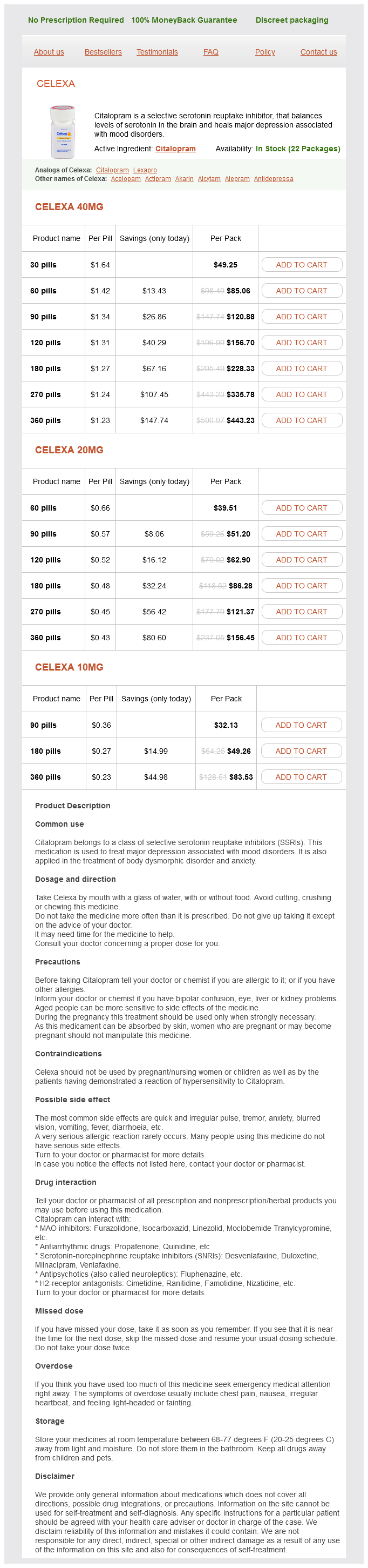 Celexa packs: 30 pills, 60 pills, 90 pills, 120 pills, 180 pills, 270 pills, 360 pills