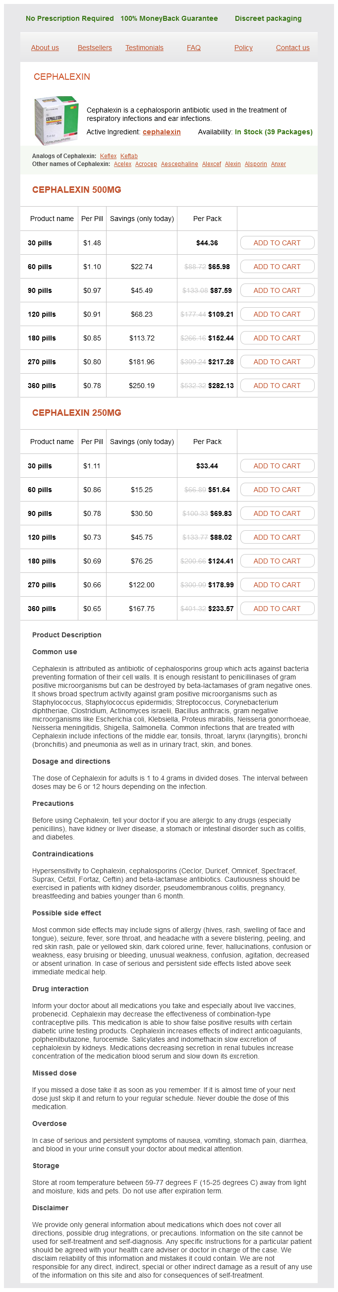 Cephalexin packs: 30 pills, 60 pills, 90 pills, 120 pills, 180 pills, 270 pills, 360 pills