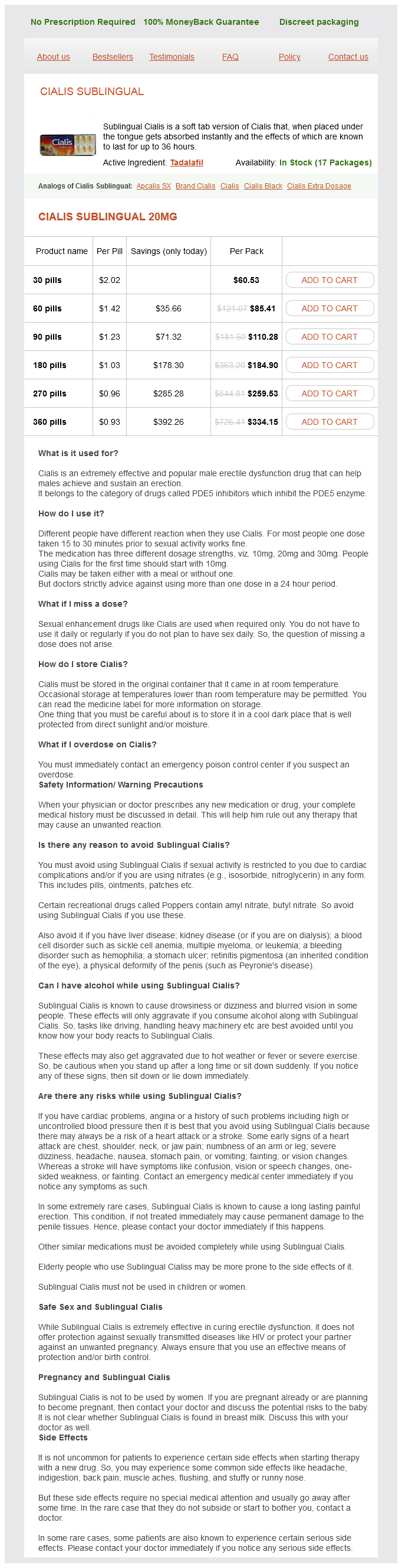 Cialis Sublingual packs: 30 pills, 60 pills, 90 pills, 180 pills, 270 pills, 360 pills