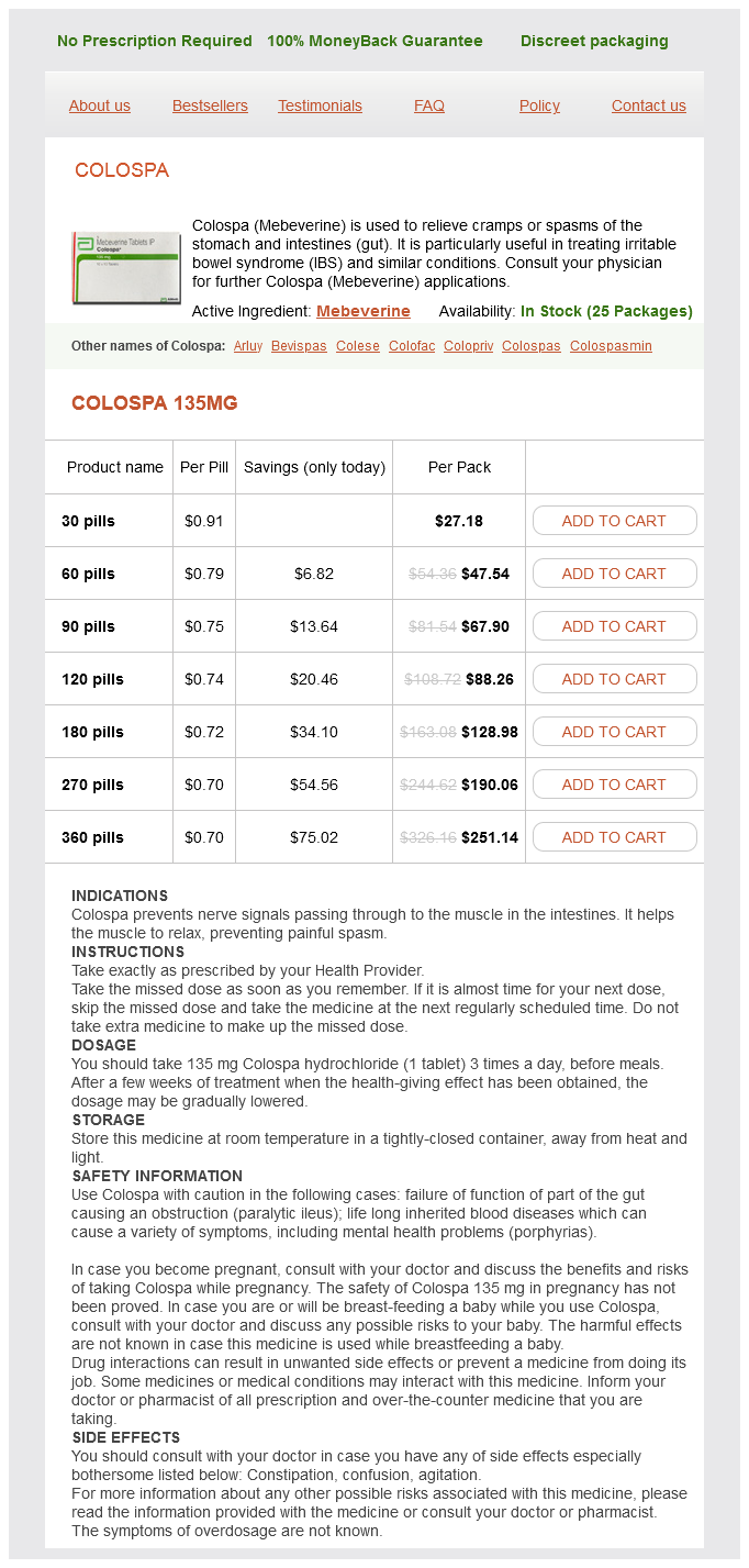 Colospa packs: 30 pills, 60 pills, 90 pills, 120 pills, 180 pills, 270 pills, 360 pills