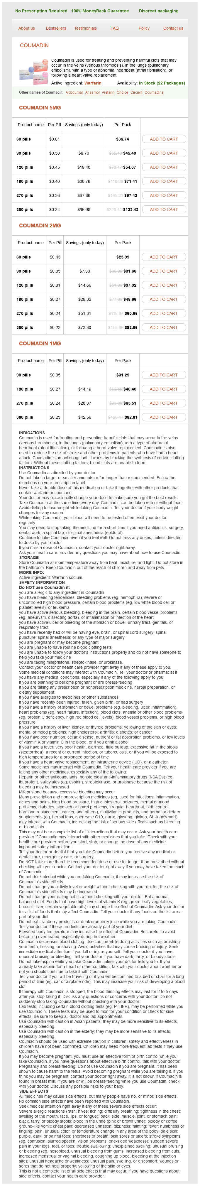 Coumadin packs: 60 pills, 90 pills, 120 pills, 180 pills, 270 pills, 360 pills