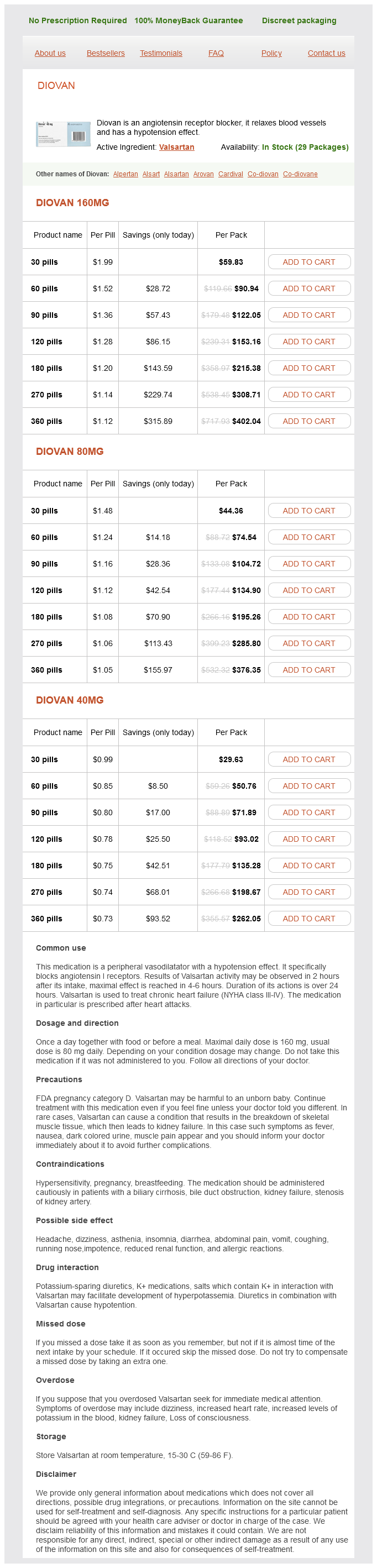 Diovan packs: 30 pills, 60 pills, 90 pills, 120 pills, 180 pills, 270 pills, 360 pills