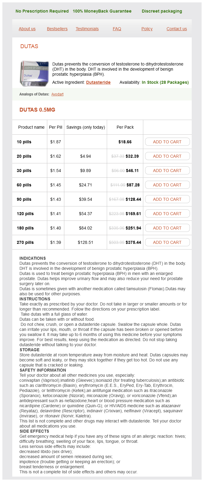 Dutas packs: 10 pills, 20 pills, 30 pills, 60 pills, 90 pills, 120 pills, 180 pills, 270 pills