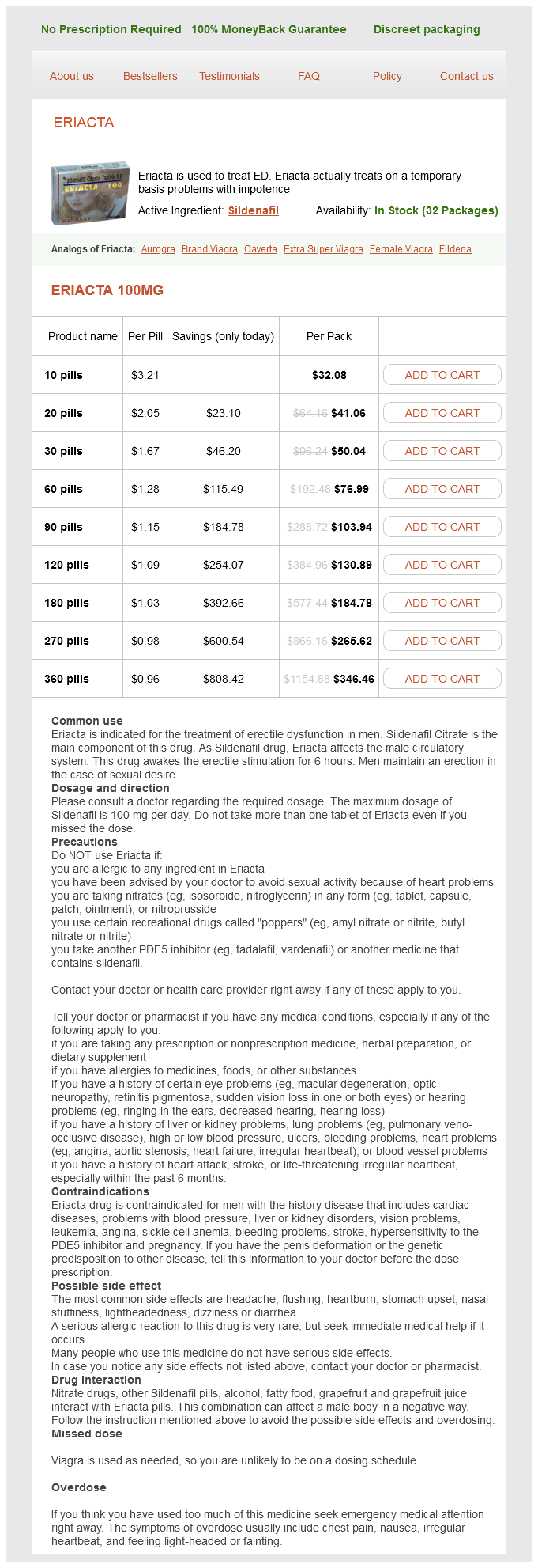 Eriacta packs: 10 pills, 20 pills, 30 pills, 60 pills, 90 pills, 120 pills, 180 pills, 270 pills, 360 pills