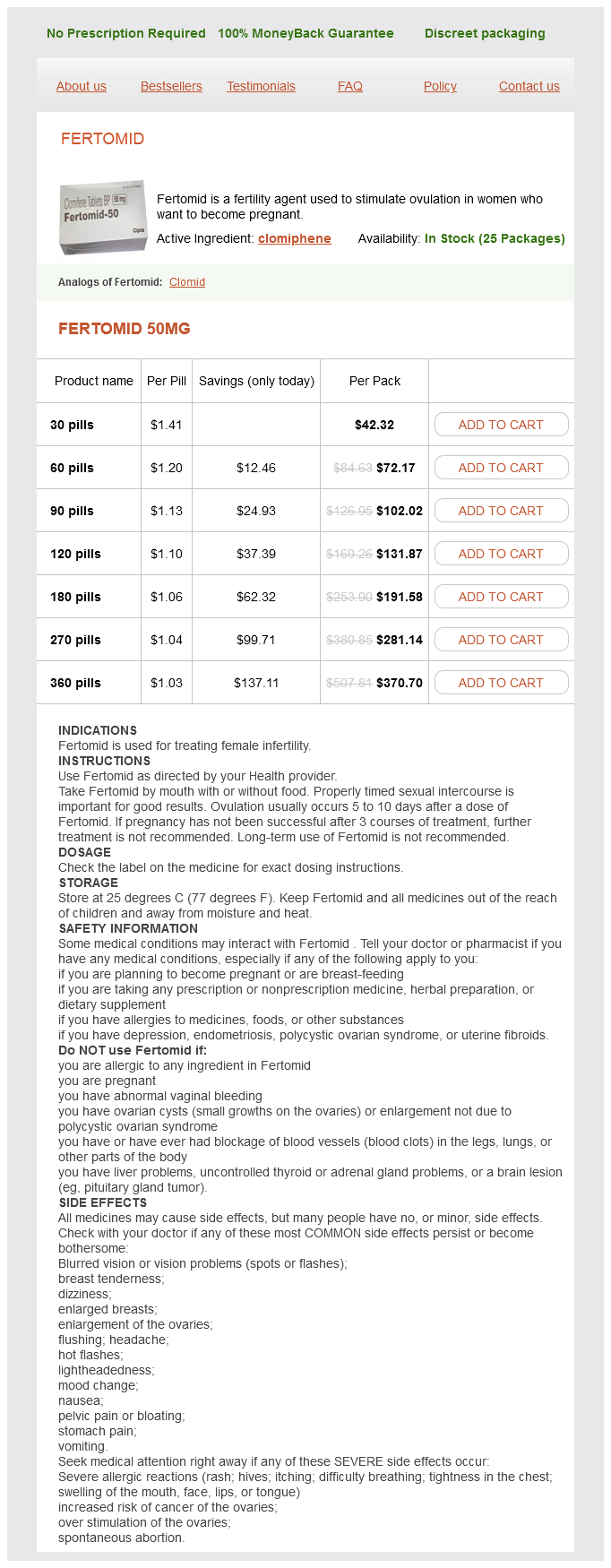 While surgical intervention can assist in the effectiveness of medical therapy menopause for men purchase fertomid 50 mg free shipping, surgery typically is not a cure for the underlying mucosal disease. Nasal polyps in cystic fibrosis and in certain Asian populations, for example, demonstrates non-eosinophilic profiles. They are organized communities of microorganisms within a polysaccharide matrix that provides protection from host defenses and antibiotics. It is important to recognize that bacteria exist preferentially in nature in an organized form rather than as individual planktonic microorganisms, and that biofilms can 2154 be present on the surface of healthy paranasal sinus mucosa. Mice studies demonstrate enhanced local sinonasal T-suppressor and T-regulatory cell response with mucosal inflammation and hyperresponsiveness following exposure with Sendai virus. Cigarette Smoke In addition to infectious triggers, environmental factors have been noted to induce sinonasal mucosal irritation. Cigarette smoke impacts the innate immune 2155 function of the sinonasal epithelial cells and creates local irritation and cytotoxic effects. Cigarette smoke has been demonstrated in mice to activate the complement system to create direct mucosal damage. Deficiency in complement components C3 and factor B was found to be protective against such damage. Prospective cohort studies without placebo control have demonstrated temporal improvement in symptoms and no difference in effectiveness among amoxicillin-clavulonate, ciprofloxacin, and cefuroxime. Macrolide antibiotics have garnered interest for their additional antiinflammatory characteristics. The antiinflammatory effect of macrolides were initially discovered from their therapeutic benefit in dramatically improving diffuse panbronchiolitis, a previously deadly airway inflammatory disorder. Significant statistical improvement in global patient rating was seen with roxithromycin compared to placebo. The antiinflammatory activity of macrolides seems to stem from immunomodulation;22 however, they seem to influence neutrophil-dominated inflammation more than atopy and eosinophilia. Depending on the antibiotic, the most common adverse effects include diarrhea and vaginal yeast infections. More severe adverse effects include Clostridium difficilecolitis, allergic reactions (from urticaria to anaphylaxis), and Steven-Johnson syndrome. In addition, the physician should be mindful that frequent antibiotic administration can lead to resistant microorganisms. The mechanism of corticosteroid action involves inhibition of arachidonic acid synthesis, decreased levels of expression of multiple interleukins, and a direct inhibitory effect on eosinophils. Mometasone furoate and fluticasone propionate are highly lipophilic and have extremely low systemic bioavailability, with only 0. There are currently no clinical studies to support the use systemic corticosteroids in this population. These compounds are stored in mast cells, among other cells, and when released promote inflammation and act as early- and late-phase mediators of the allergic response. Two antileukotriene classes of medications are currently available: suffixlukast (montelukast or zafirlukast), which bind to cysteinyl leukotriene receptors, and zileuton, which enzyme 5-lipoxygenase.