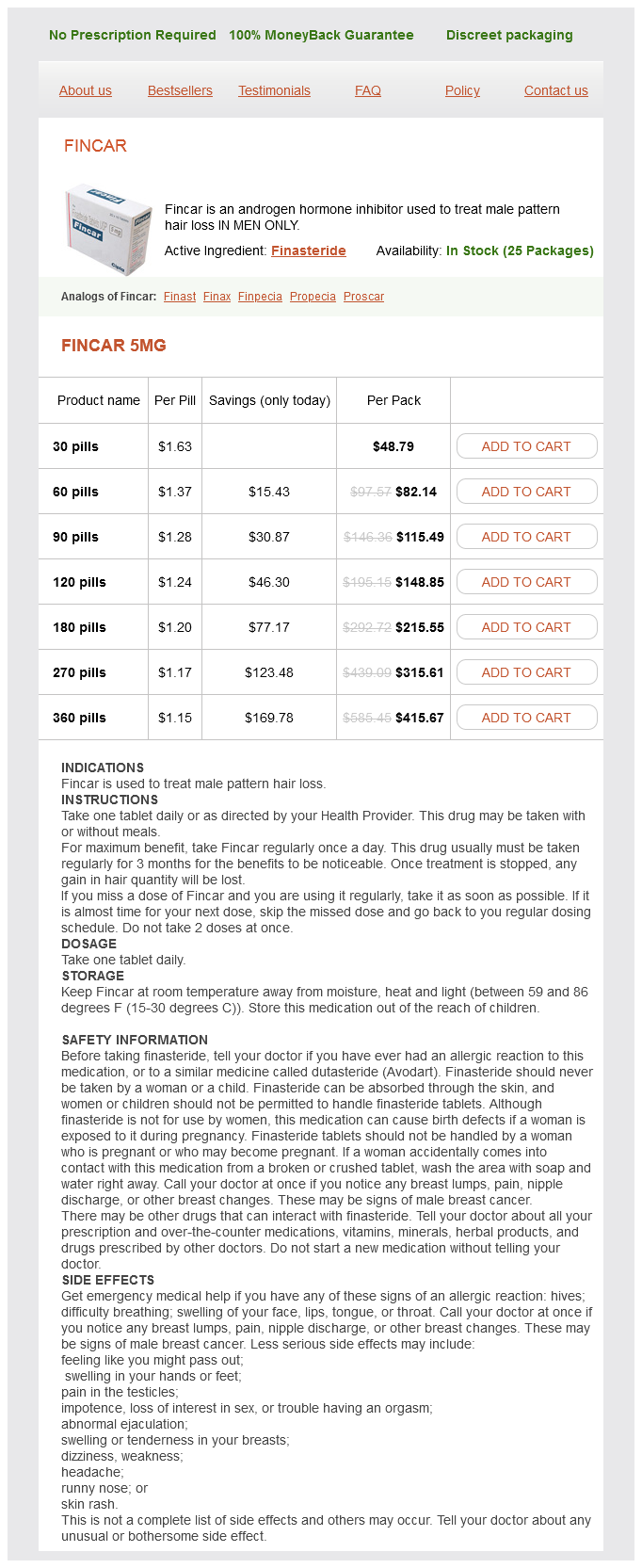 Fincar packs: 30 pills, 60 pills, 90 pills, 120 pills, 180 pills, 270 pills, 360 pills