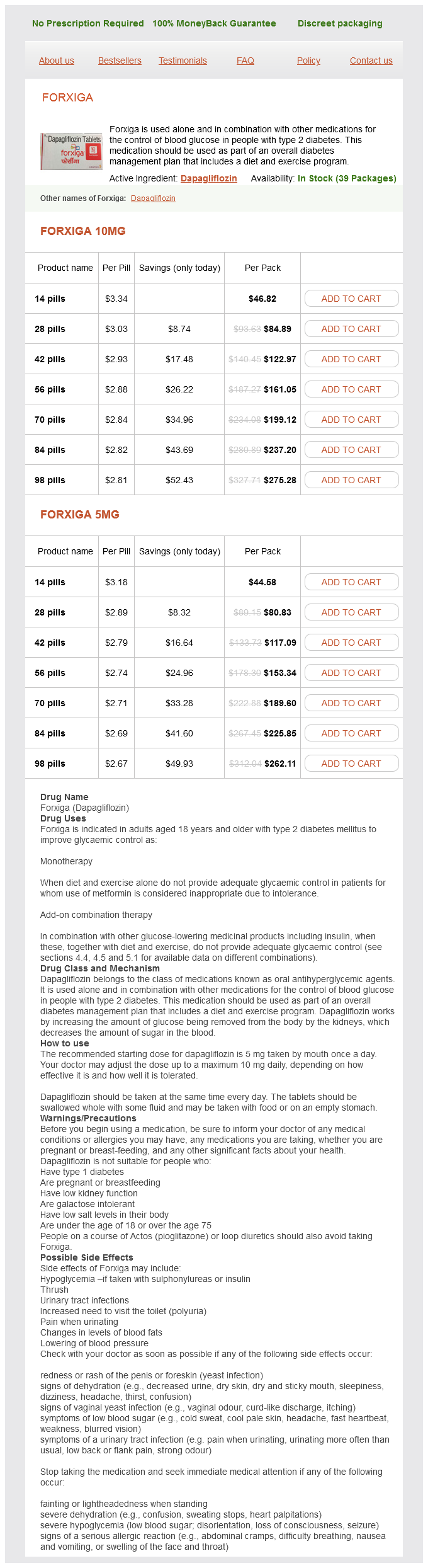 Forxiga packs: 14 pills, 28 pills, 42 pills, 56 pills, 70 pills, 84 pills, 98 pills