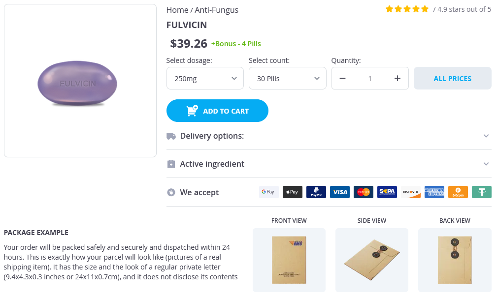 Fulvicin packs: 30 pills, 60 pills, 90 pills, 120 pills, 180 pills, 270 pills, 360 pills