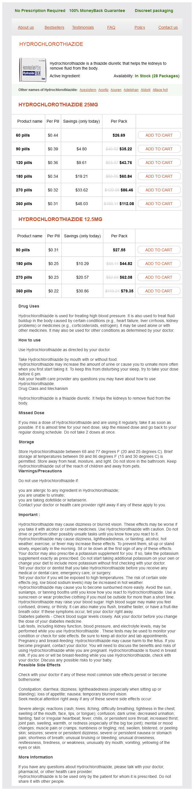 Hydrochlorothiazide packs: 60 pills, 90 pills, 120 pills, 180 pills, 270 pills, 360 pills