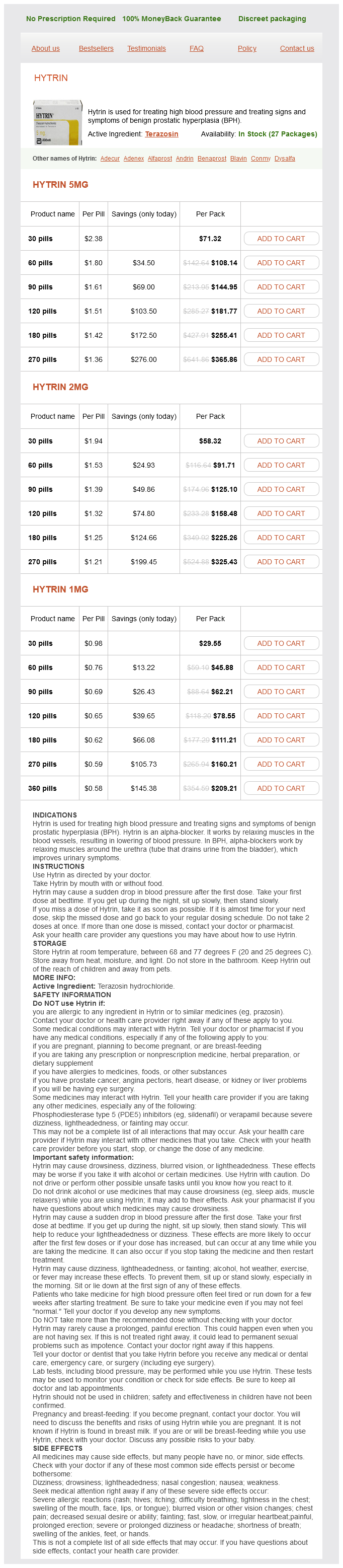 Hytrin packs: 30 pills, 60 pills, 90 pills, 120 pills, 180 pills, 270 pills, 360 pills