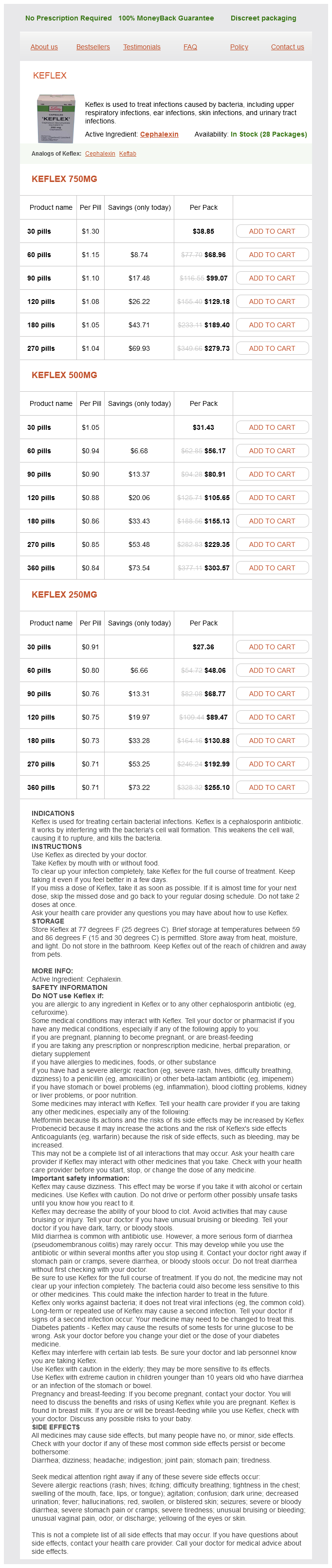 Keflex packs: 30 pills, 60 pills, 90 pills, 120 pills, 180 pills, 270 pills, 360 pills