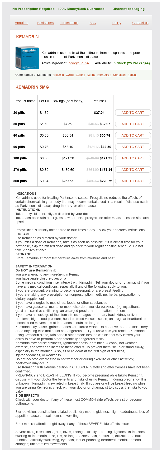 Kemadrin packs: 20 pills, 30 pills, 60 pills, 90 pills, 180 pills, 270 pills, 360 pills