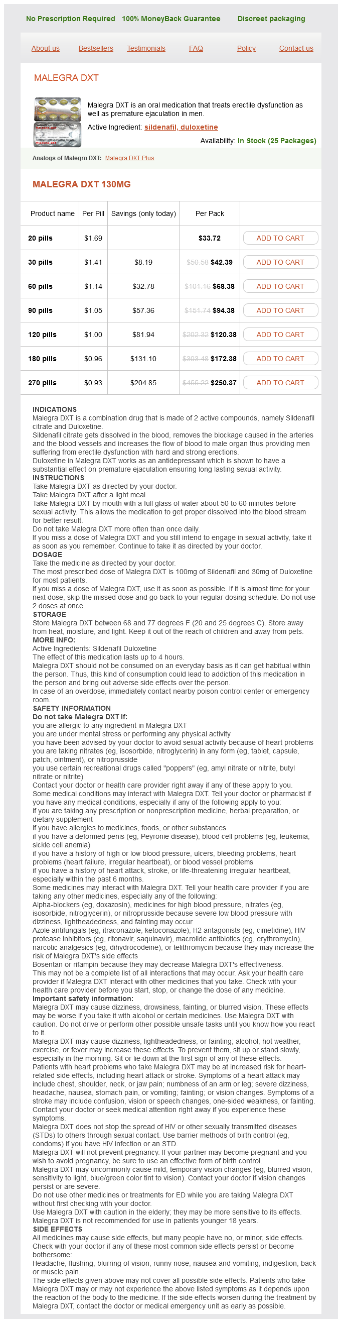 Malegra DXT packs: 20 pills, 30 pills, 60 pills, 90 pills, 120 pills, 180 pills, 270 pills