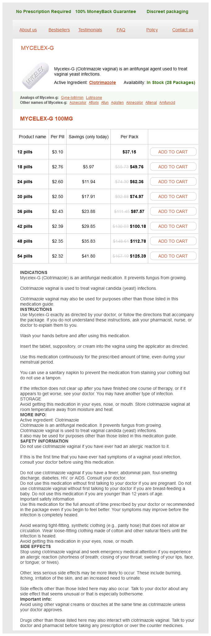They treated 12 patients with biofeedback technique focused on voluntary relaxation of the external anal sphincter fungus gnats vodka purchase 100 mg mycelex-g overnight delivery. Subsequent studies using biofeedback failed to replicate these positive results, with success rates varying from 35% to 87. All studies were uncontrolled and limited by small sample size and poorly standardized treatment modalities [1]. The biofeedback protocol was identical to the one commonly used in constipation due to dyssynergic defecation [36]. A physiological assessment including anorectal manometry and balloon evacuation was carried-out at baseline and at 13 months followup. In addition, self-reported stool frequency was assessed at baseline and at 6-month follow-up. Secondary outcomes included subjective pain improvement on an ordinal scale, number of days per month with rectal pain, and visual analog scale ratings of pain. Benefits were well maintained throughout follow-up and no side effects were reported with any treatment. The mechanism for achieving adequate pain relief was consistent with an improvement in pelvic floor function from being unable to relax anal canal pressures on straining to being able to do so and/or an improvement in the balloon evacuation test from being unable to pass a 50 mL water filled balloon to being able to do so [26]. Depression and anxiety are both frequently reported in non-responsive proctalgia patients [1, 20]. In addition, no trial has systematically evaluated the effect of either psychotherapy or psychotropic drugs. Small case series reported significant improvement of pain in approximately 40% of patients with of tricyclic antidepressant therapy [27]. There is no evidence that surgery can help proctalgia unless an organic disease is found. Mark Hospital for functional anorectal pain, most of them had a final diagnosis of chronic proctalgia after physiological testing [27]. Vast majority of patients had undergone some surgical interventions before referral, but without any resolution of their symptoms. This included treatment of hemorrhoids (55 subjects), anal sphincterotomy (29 subjects), anal stretch (27 subjects), rectocele plication (1 subject), and even de-functioning ileostomy (1 subject). Finally a marginally invasive surgical procedure like sacral neuromodulation seems to have no role [39]. Proctalgia fugax Definition Proctalgia Fugax is characterized by sharp, recurring, often self-limiting anorectal pain in the absence of an organic disease.