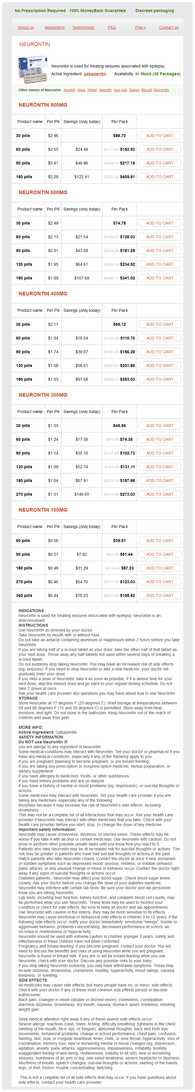 Neurontin packs: 30 pills, 60 pills, 90 pills, 180 pills, 120 pills, 270 pills, 360 pills