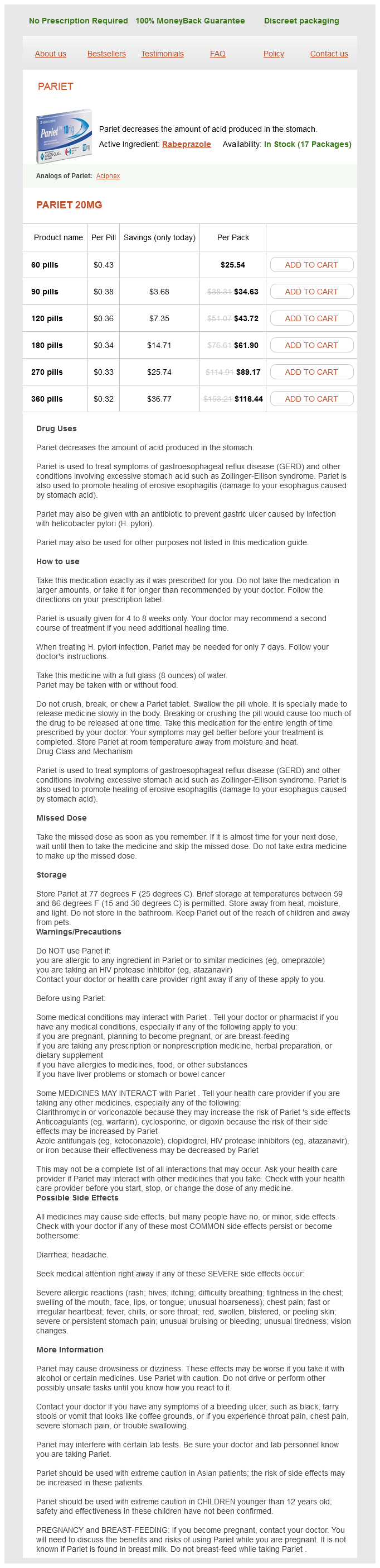 Pariet packs: 60 pills, 90 pills, 120 pills, 180 pills, 270 pills, 360 pills