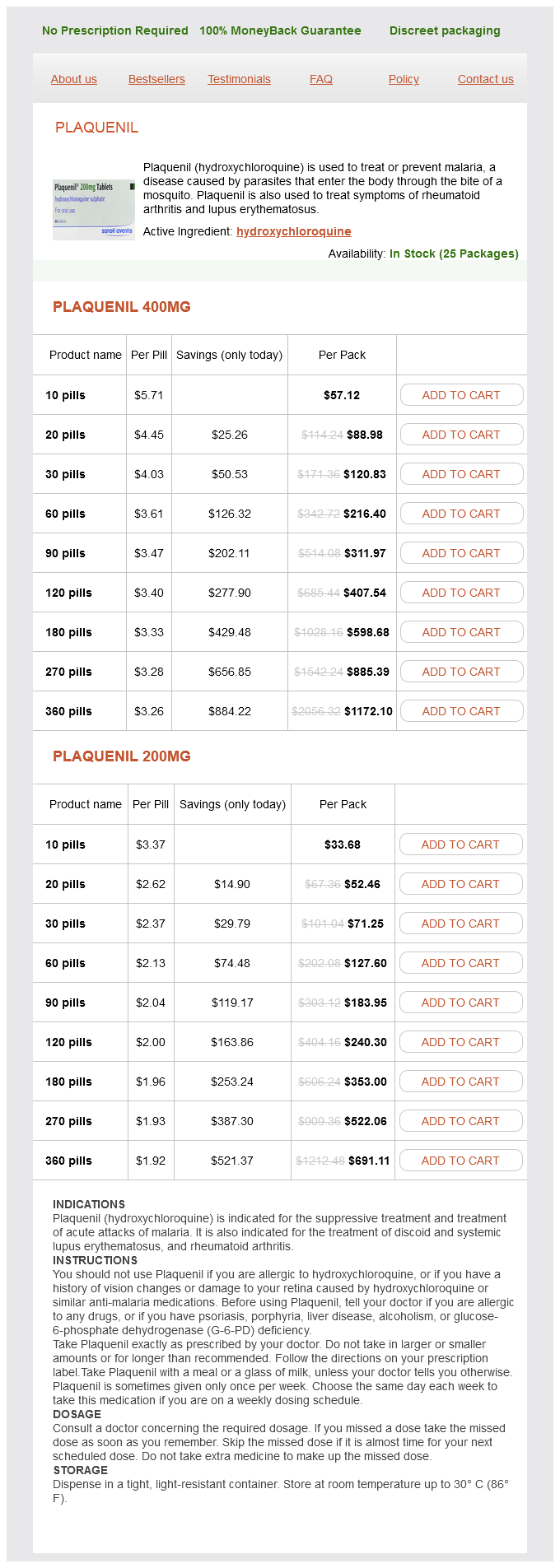 The use of prophylactic antibiotics arthritis uveitis buy 400 mg plaquenil with visa, while theoretically attractive, is controversial and their value unproven despite at least 7 prospective trials of various quality. Recent meta-analyses have concluded that prophylactic antibiotics cannot be recommended for preventing pancreatic infection, since there is no difference in the rate of infected necrosis, systemic complications, or mortality between the treated and control groups. Yet another meta-analysis and a systematic review suggested that use of imipenem reduces mortality in severe acute pancreatitis, but not the rate of infected necrosis. There is concern, however, that the use of potent broad-spectrum antibiotics may increase the risk of secondary or superimposed fungal infections. Published guidelines do not recommend prophylactic antibiotics for patients with necrotizing pancreatitis. Certainly, there is no indication for routine antibiotics in treating mild or interstitial pancreatitis. Clinically, patients with severe pancreatitis often have features of sepsis, including fever, leukocytosis, and organ failure in the first 7 to 10 days. During this interval, while sources of potential infection are being investigated and after appropriate cultures are obtained, antibiotic therapy is appropriate. Detection of Pancreatic Infection Sterile or infected acute necrotizing pancreatitis can be difficult to distinguish clinically, because either may produce fever, leukocytosis, and severe abdominal pain. Without intervention, the mortality rate for patients with infected acute necrotizing pancreatitis is nearly 100%. This aspiration method is safe, accurate (96% sensitivity and 99% specificity), and recommended for patients with acute necrotizing pancreatitis whose condition deteriorates clinically or does not improve despite aggressive supportive care. Ultrasonographically guided aspiration may have lower sensitivity and specificity, but it can be performed at the bedside. If initial sampling is negative, surveillance aspiration may be advisable Nutritional Support Nutritional support is often indicated to meet increased metabolic demands and to rest the pancreas during the prolonged fasting state of acute pancreatitis. Multiple randomized prospective studies of severe acute pancreatitis have compared total parenteral nutrition with enteral feeding through a nasoenteric feeding tube placed under endoscopic or radiographic guidance. Enteral feeding yields significantly fewer total and infectious complications, a 3-fold decrease in the cost of nutritional support, and improvement in the acute phase response and disease severity scores, compared with parenteral (intravenous) nutrition. If Gram stains show gram-positive organisms, the addition of vancomycin is appropriate. In all cases, antibiotic coverage can be narrowed or expanded once the identity and sensitivities of the organism are known. A Therapy for Pancreatic Necrosis Débridement of pancreatic necrosis is indicated for confirmed infection of extensive necrosis and for infected or sterile necrosis with expanding fluid collections causing severe pain or gut obstruction. Débridement can be accomplished by endoscopic, percutaneous radiologic, or minimally invasive or open surgical approaches. A recent randomized multicenter study compared open surgical necrosectomy to a "step-up" approach, which began with percutaneous drainage and, if necessary, advanced to use of minimally invasive retroperitoneal surgical necrosectomy. The step-up approach group had lower rates of major complications, new-onset multiorgan failure, incisional hernias, and new-onset diabetes mellitus. Early deaths (1-2 weeks after the onset of pancreatitis; approximately 50% of all deaths) are primarily due to multisystem organ failure, and late deaths result from local or systemic infections.