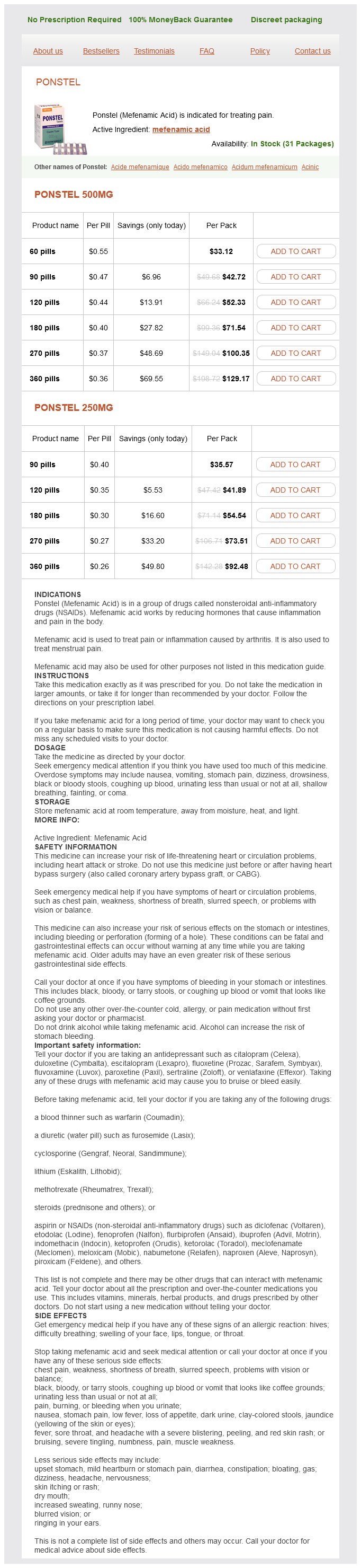 Ponstel packs: 60 pills, 90 pills, 120 pills, 180 pills, 270 pills, 360 pills