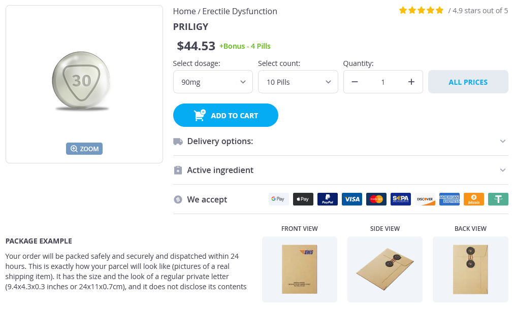 - Priligy 90mg × 10 Pills - $44.53