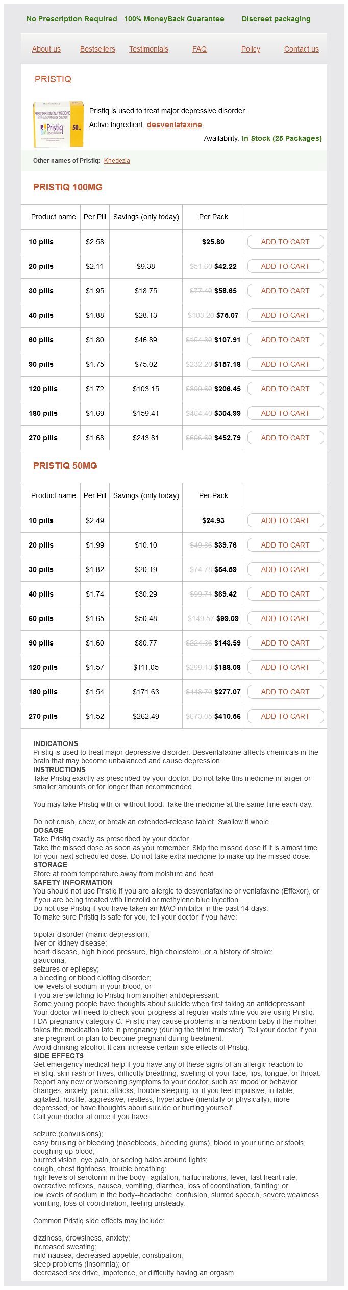 Pristiq packs: 10 pills, 20 pills, 30 pills, 40 pills, 60 pills, 90 pills, 120 pills, 180 pills, 270 pills