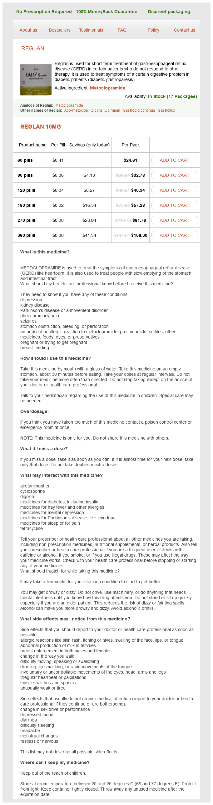 Reglan packs: 60 pills, 90 pills, 120 pills, 180 pills, 270 pills, 360 pills