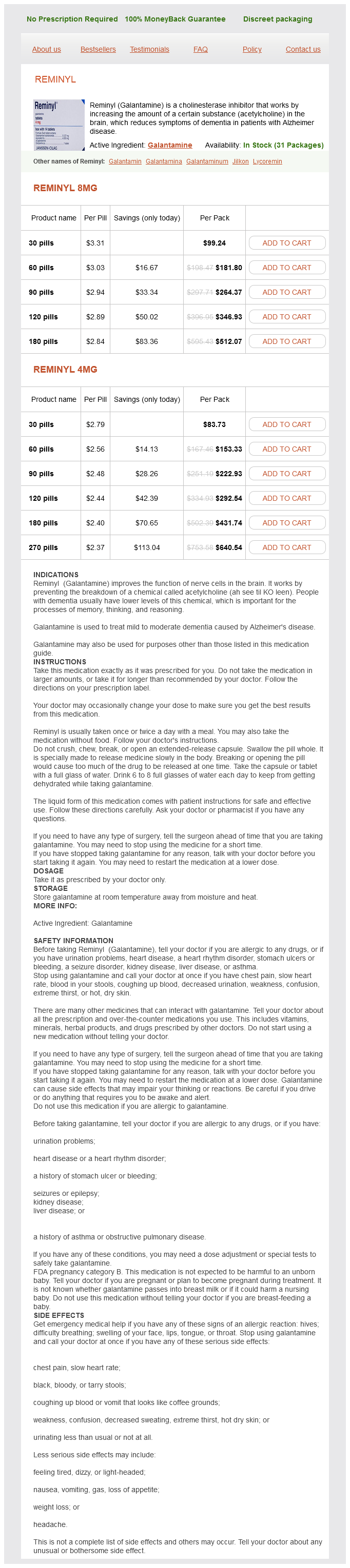 Reminyl packs: 30 pills, 60 pills, 90 pills, 120 pills, 180 pills, 270 pills