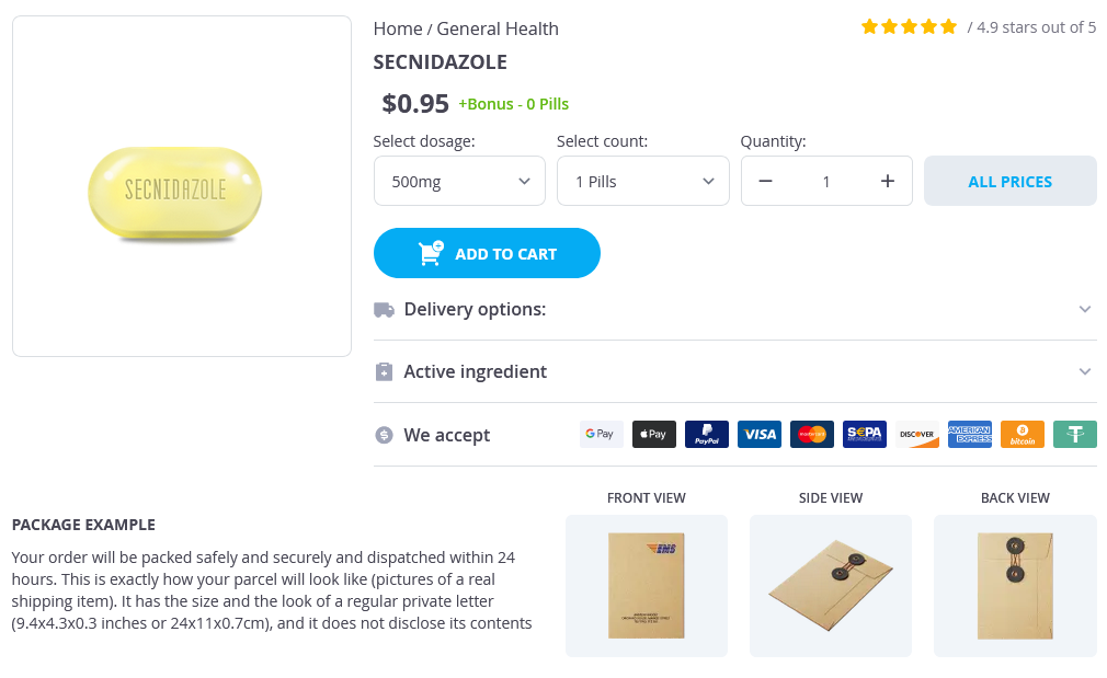 Secnidazole packs: 1 pills, 12 pills, 24 pills, 36 pills, 60 pills, 120 pills