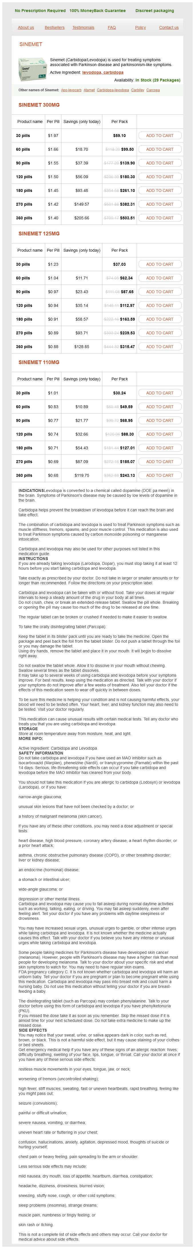Sinemet packs: 30 pills, 60 pills, 90 pills, 120 pills, 180 pills, 270 pills, 360 pills
