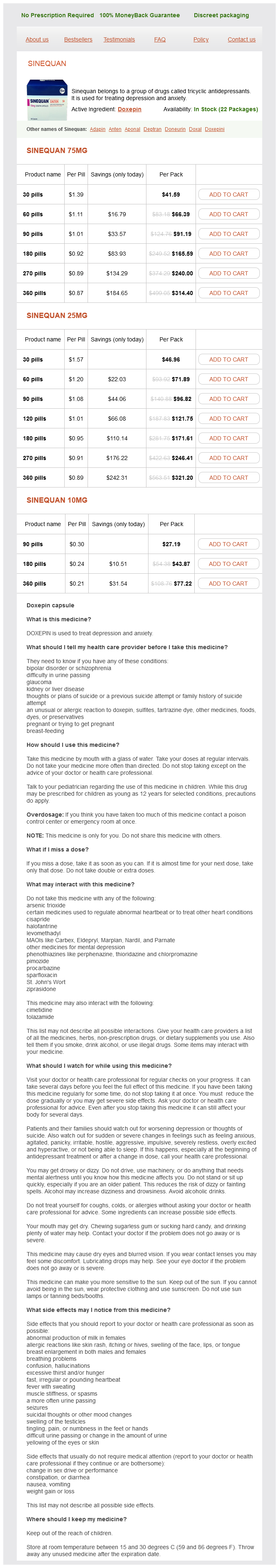 Sinequan packs: 30 pills, 60 pills, 90 pills, 180 pills, 270 pills, 360 pills, 120 pills