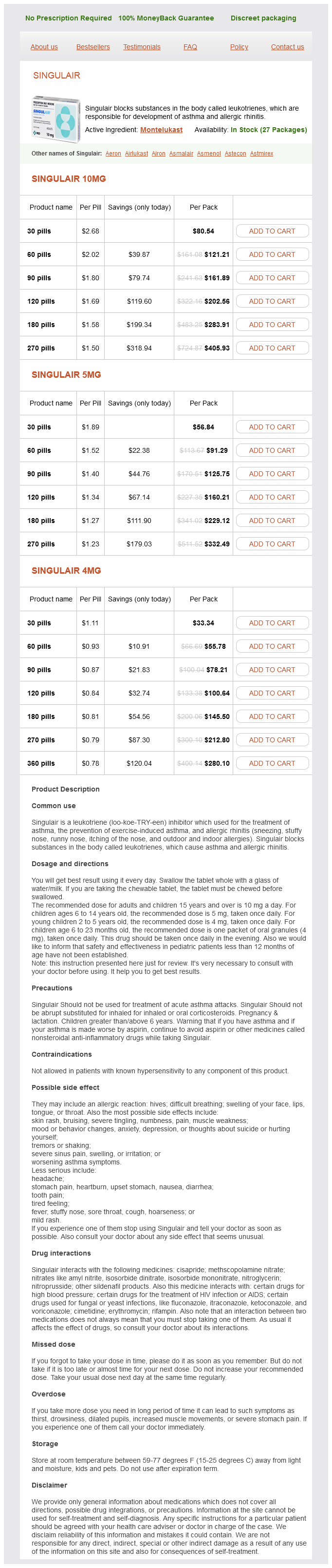 Singulair packs: 30 pills, 60 pills, 90 pills, 120 pills, 180 pills, 270 pills, 360 pills