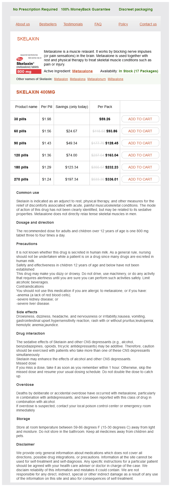 For everyone spasms back pain and sitting skelaxin 400 mg buy fast delivery, a degree of sensory loss lasting at least four years-and sometimes a lifetime-is inevitable. About 65% of people with severe frostbite will eventually develop arthritis in the affected hand, foot, or leg. Hypothermia, Frostbite, and Other Cold Injuries: Prevention, Survival, Rescue and Treatment. To prevent heat loss and keep the blood circulating properly, clothing should be worn loosely and in layers. Covering the hands, feet, and head is also crucial for preventing heat loss; mittens are better than gloves for keeping hands warm. Outerwear should be wind- and water-resistant; and wet clothing and footwear must be replaced as quickly as possible. People should also be aware of the early warning signs of frostbite, which include redness of the skin, prickling sensations, and numbness. Alcohol and drugs should be avoided because of their harmful effects on judgment and reasoning. Experts also warn against alcohol use and smoking in the cold because of the circulatory changes they produce. Paying close attention to the weather report before venturing outdoors and avoiding such unnecessary risks as driving in isolated areas during a blizzard are also important precautionary measures. In addition, when traveling in cold weather, people should carry emergency supplies and warm clothing in case they become stranded. Last, people who are hiking or skiing in cold temperatures should use a buddy system 2050 Bruen, K. Artifacts recovered from an Egyptian tomb indicate that puffer fish poisoning has been known since approximately 24002700 B. In journals covering expeditions from 17721775, Pacific explorer Captain James Cook provided a vivid description of what some believe to be puffer fish poisoning. Scientists have found that toxic fugu have unique exocrine glands for the secretion of tetrodotoxin. The fish appear to actively produce the toxin, rather than passively acquire it from the environment. For these fish, tetrodotoxin may serve as a natural defense mechanism to repel predators. The flesh of the fugu is generally eaten raw in paper-thin slices, known as sashimi. Part of the reported delight in eating fugu is the tingling oral sensation induced by minute amounts of tetrodotoxin in the flesh. For this reason, eating fugu is considered an 'experience,' rather than just a meal in Japan.