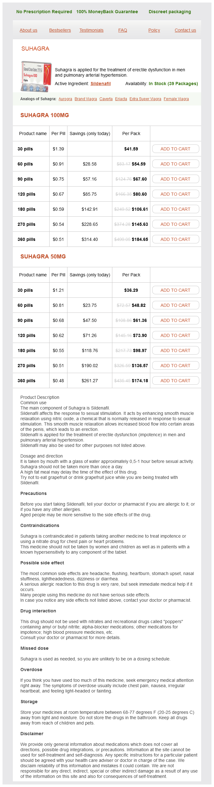 Suhagra packs: 30 pills, 60 pills, 90 pills, 120 pills, 180 pills, 270 pills, 360 pills