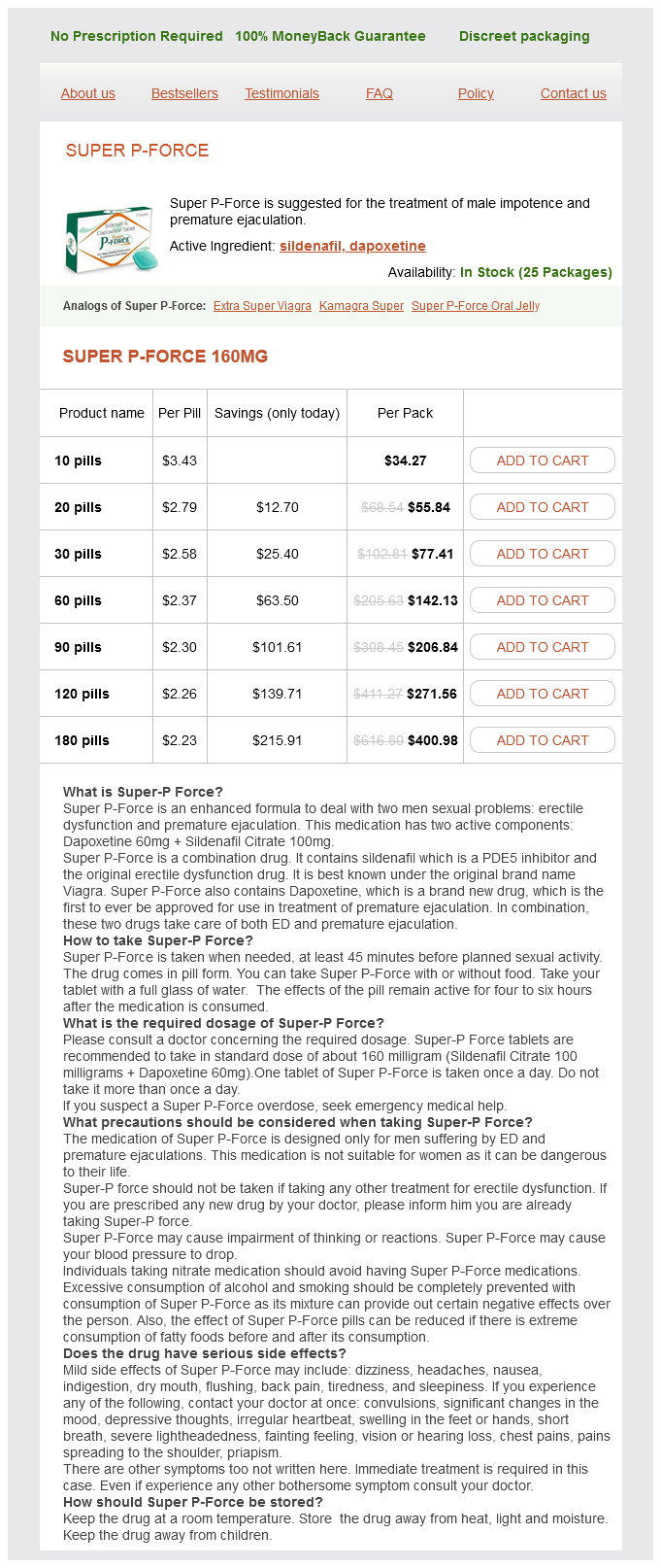 Super P-Force packs: 10 pills, 20 pills, 30 pills, 60 pills, 90 pills, 120 pills, 180 pills