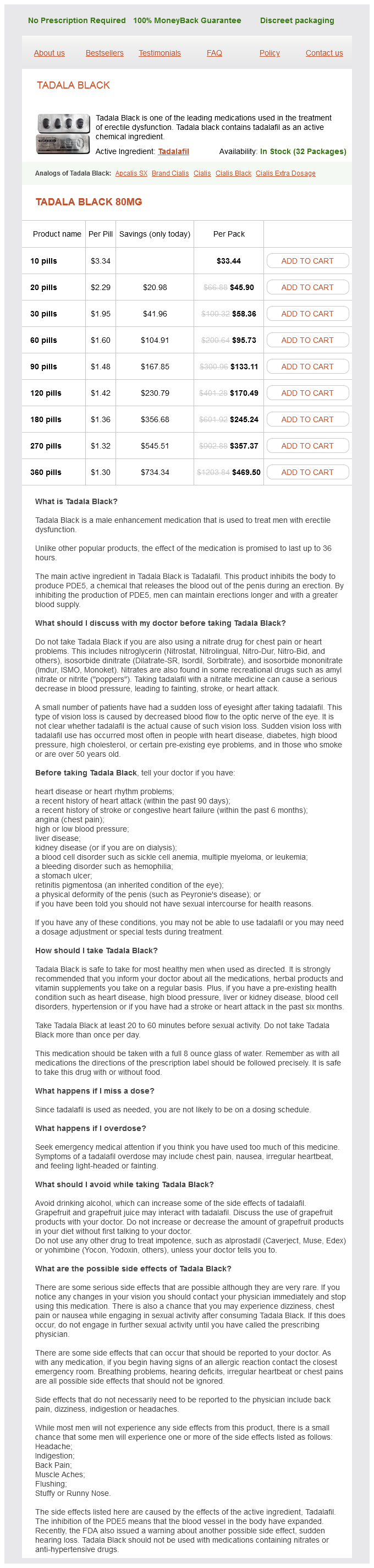 Tadala Black packs: 10 pills, 20 pills, 30 pills, 60 pills, 90 pills, 120 pills, 180 pills, 270 pills, 360 pills