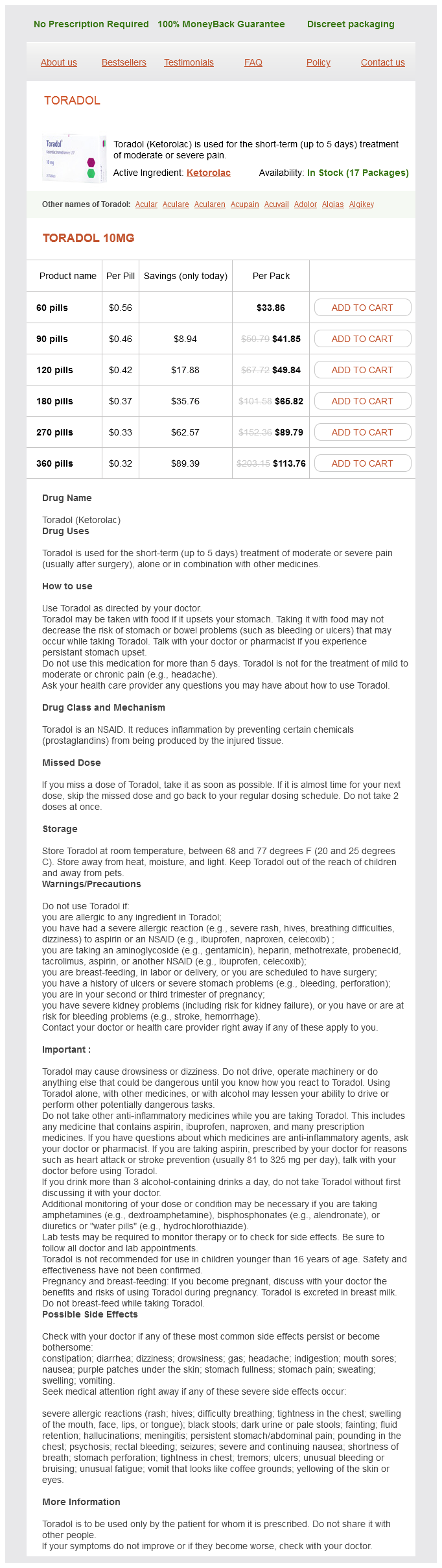 Toradol packs: 60 pills, 90 pills, 120 pills, 180 pills, 270 pills, 360 pills