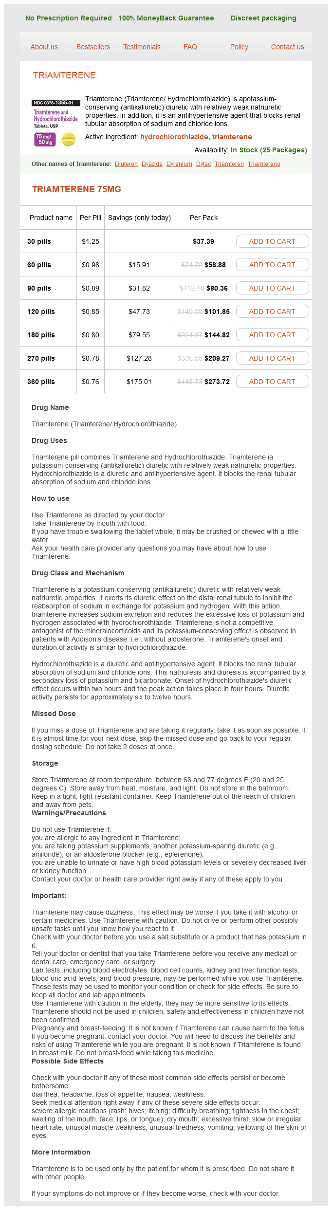 Triamterene packs: 30 pills, 60 pills, 90 pills, 120 pills, 180 pills, 270 pills, 360 pills